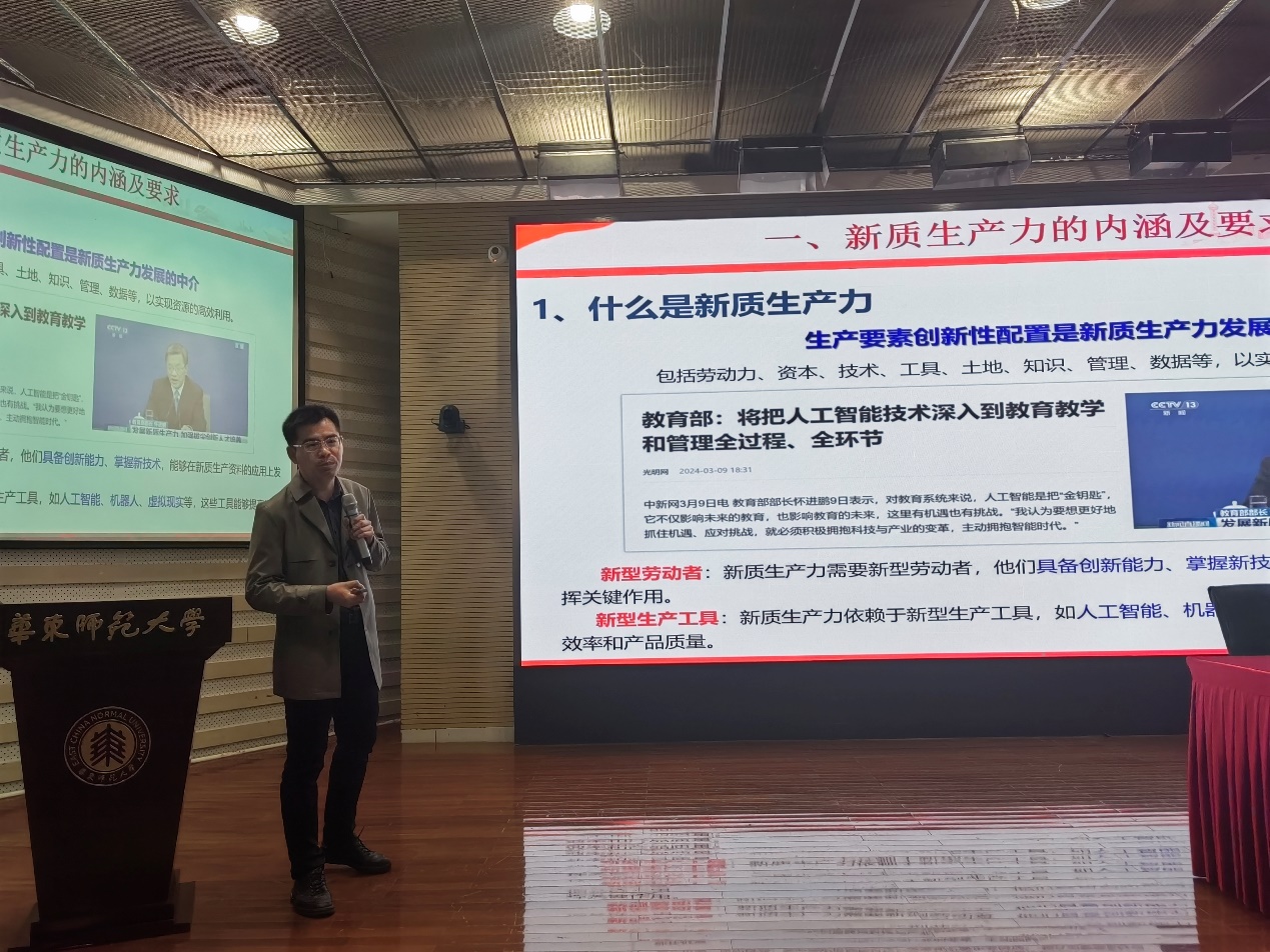 接着,老司机 挂职副院长、贵州六盘水师范学院化学与材料工程学院院长雷以柱教授为学员们进行首场讲座,报告主题为“深刻把握新质生产力的内涵及要求,为推动高质量发展贡献高校力量”。雷老师结合自身教学和科研的相关工作,深刻阐释了新质生产力的内涵及要求,以及高校在锻造新质生产力方面的应有之力。他特别讲到,高校是发展新质生产力的重要力量和关键路径,鼓励参训学员,心怀“国之大者”,抓住师大的宝贵环境,在学习科研和生活中提高自身综合素质和创新能力,做“与国家民族同呼吸共命运”的“强国一代”。