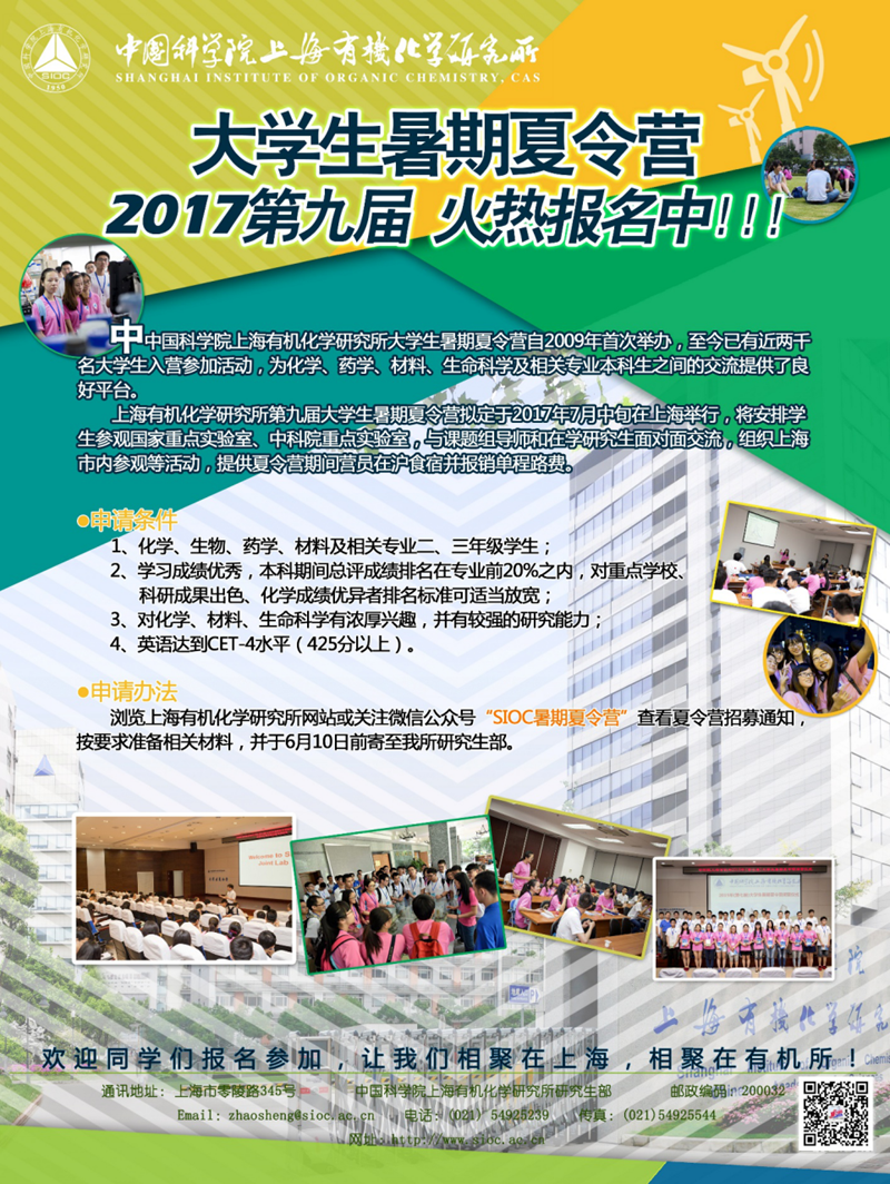 上海有机化学研究所大学生暑期夏令营定于2017年7月10至12日在上海举行。