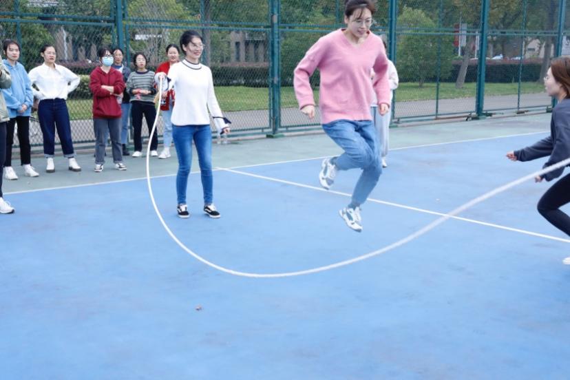 在“跳大绳”项目中,每组六名队员在两分钟内排队依次跳过大绳,以跳跃成功次数多少排出名次,其中粉队坚持不懈,以出色的表现获得了第一。
