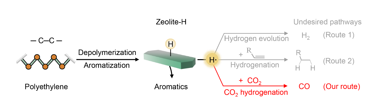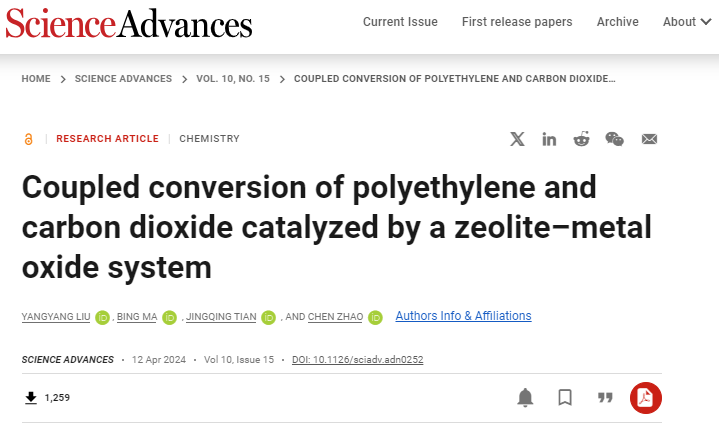 鉴于此,老司机 赵晨教授研究团队在废弃碳资源塑料和CO2的高价值利用上取得重要进展。构建了沸石-金属氧化物多相催化体系,通过芳构化-氢捕获机制耦合转化废弃聚乙烯与CO2为芳烃和CO。综合多种原位表征、同位标记、模型物的验证等手段,阐释了芳构化-氢捕获的反应机理。相关研究以“Coupled conversion of polyethylene and carbon dioxide catalyzed by a zeolite–metal oxide system”为题,于2024年4月12日发表于Science Advances。